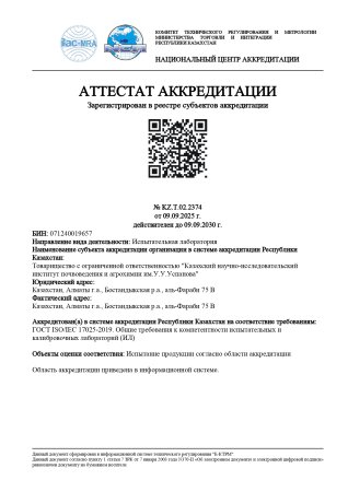 In 2020, the testing laboratory was accredited (Accreditation Certificate No. KZ.T.02.2374 dated 08/12/2020). Valid until 08/12/2025.