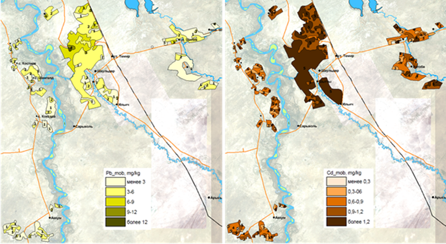 - алқаптың аумағында Zn мөлшері бойынша негізінен зерттелген аумақтың 67,8% алып жатқан 5-ші топтың топырақтары басым. Cu бойынша сәйкесінше 25,9 және 37,5 пайызды алып жатқан 3-ші және 2-ші топтың топырақтары басым. Ал Pb бойынша керсінше, осы металдың мөлшері төмен 2-ші топтың топырақтары басым, ол 52,7% жерді алып жатыр. Cd мөлшері бойынша 5-ші топтың, ал Ni бойынша 4-ші топтың топырақтары басым, олар сәйкесінше зерттелген аумақтың 70,2 және 42,2 пайызын алып жатыр. Алып жатқан контурдың саны бойынша (алалығы) Cu, Ni және Cd ерекшеленді, олардың сәйкесінше 166, 133 және 128 контуры анықталды.