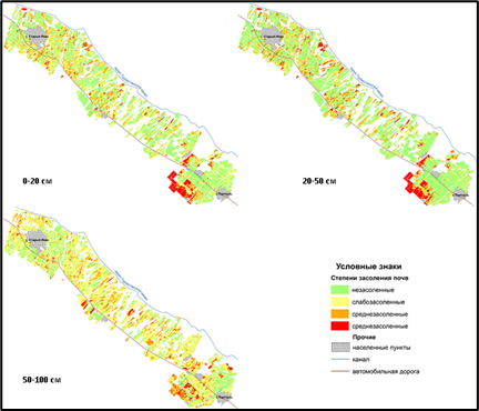 - Төрткөл алқабы аумағында олардың көлемі 14,3% (0-20 см) тереңдеген сайын 23,8% (50-100 см) дейін арта түскен, яғни аталған алқаптың аумағыныың топырақтарында тұздардың шайылу процесі бастапқы сатыда деген сөз. Ал Ескі Иқан алқабының аумағында тұзданған топырақтардың максималды (36,5%) үлесі 0-20 см қабатқа тиесілі, ал минималды үлесі 29,6% топырақтың 50-100 см қабатында, яғни аталған алқаптың аумағында топырақтардың екіншілік тұздану процесі дамыған.