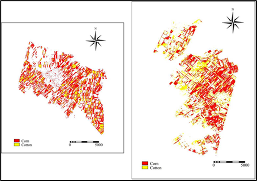 Алынған нәтижелер: - Landsat 8 OLI түсірілімдерінің спектрлік сипаттамаларын және дақылдардың фотосинтетикалық белсенділігін (биомассасын) жүгері мен мақта егістіктерін дешифрлеу үшін пайдалануға болады. Түсірілім жүргізген сәтте дақылдардың жасыл массасы мүмкіндігінше максималды болуы маңызды болып табылады.