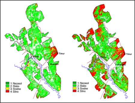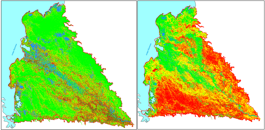 Сурет 6 – Іле өзенінің қазіргі атырауы топырағының тұздану карталары (1979 ж. – сол жақта, 2016 ж. – оң жақта)